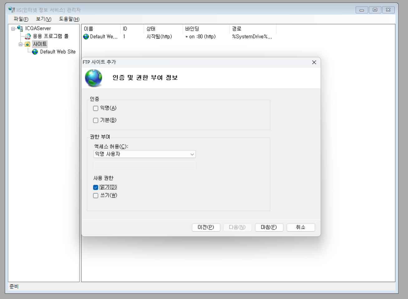 4.엑세스 허용 : 익명사용자(읽기 권한만)