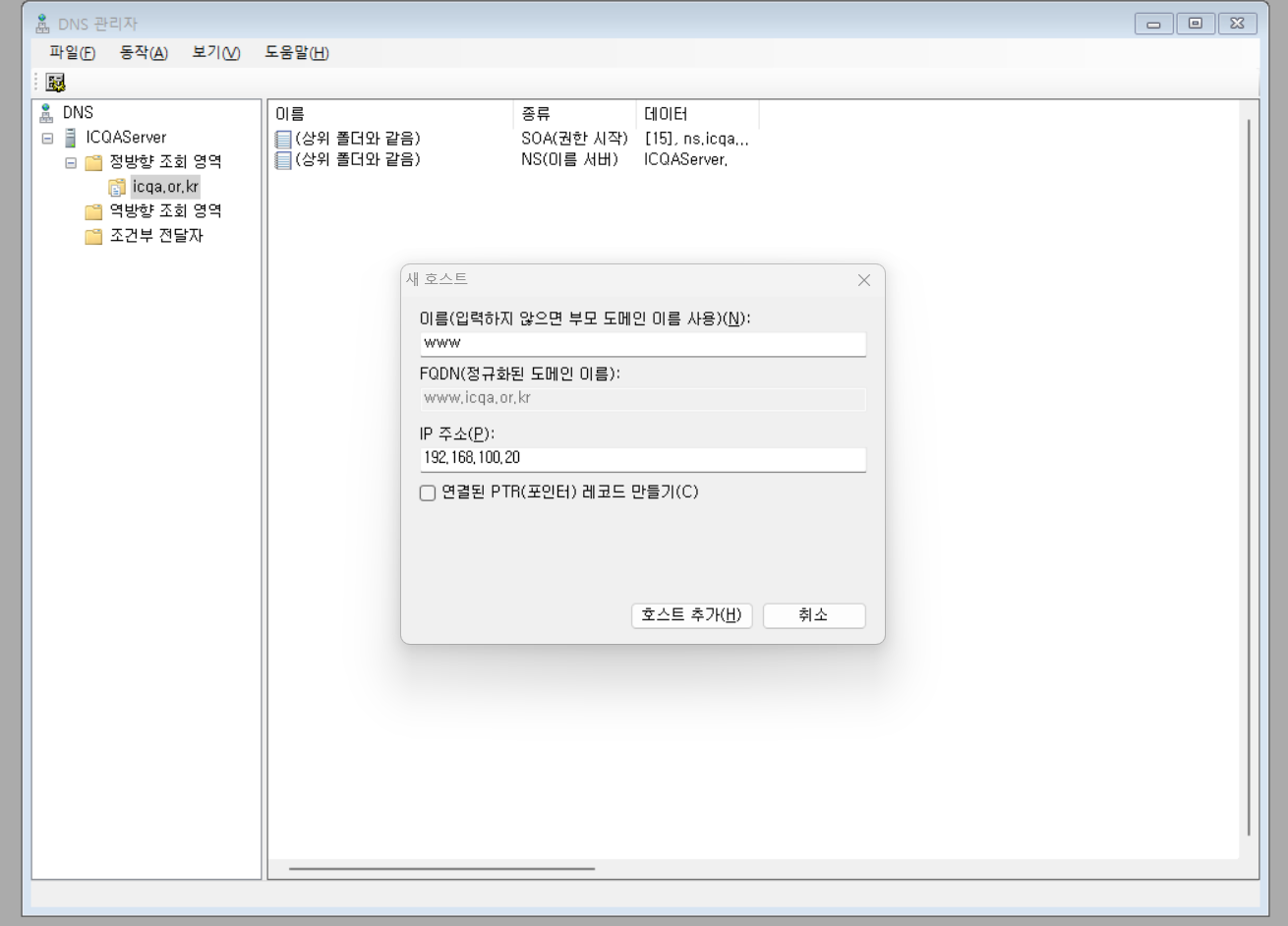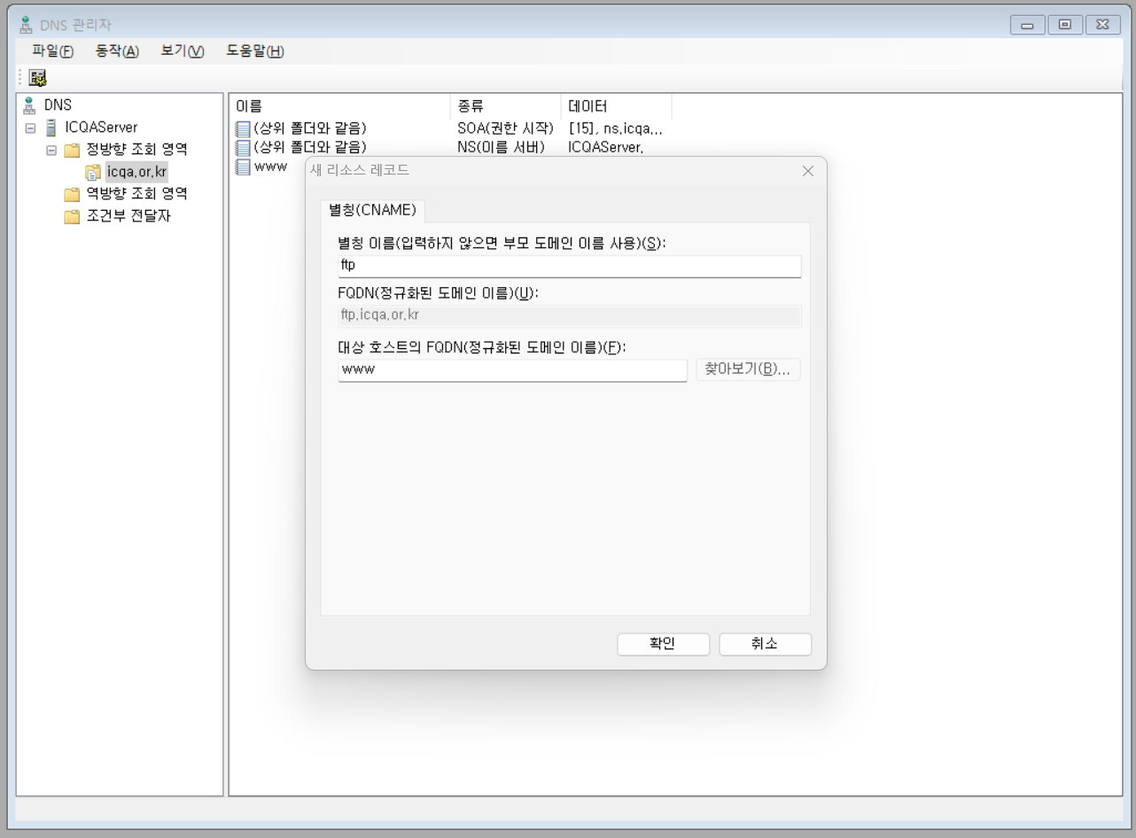2.정방향에 우클릭 - 새영역 - 영역 이름 설정에서 icqa.or.kr(soa ns 뒤와 admin 뒤에 있는 공통부분) 입력