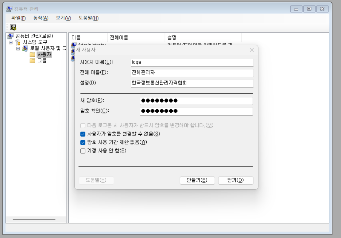 로컬 사용자및 그룹 에뮬레이터 실행 - 사용자 우클릭 - 새 사용자