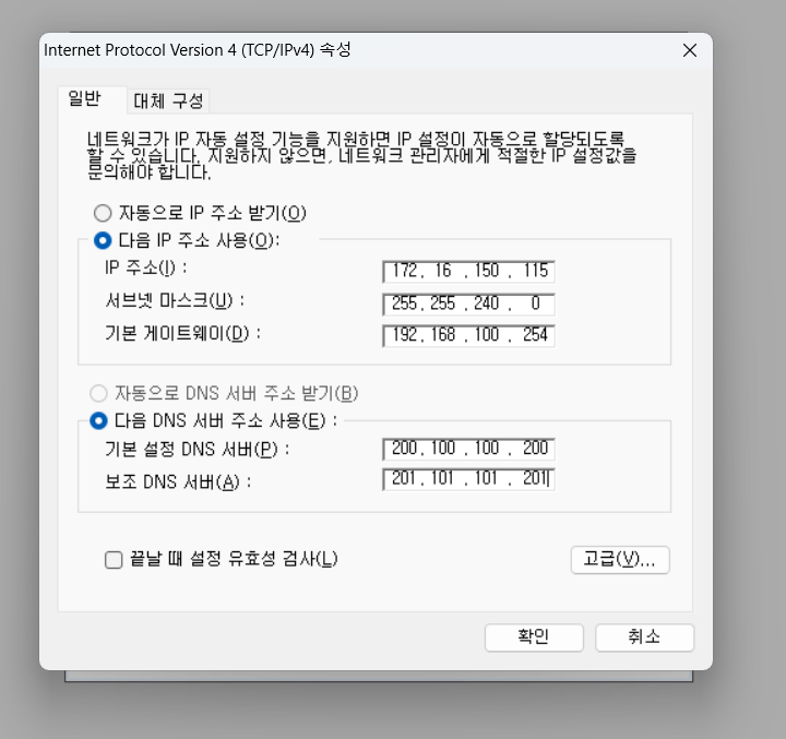 internet protocol version 4(tcp/ip) 로 들어가서 아이피와 서브넷마스크 설정