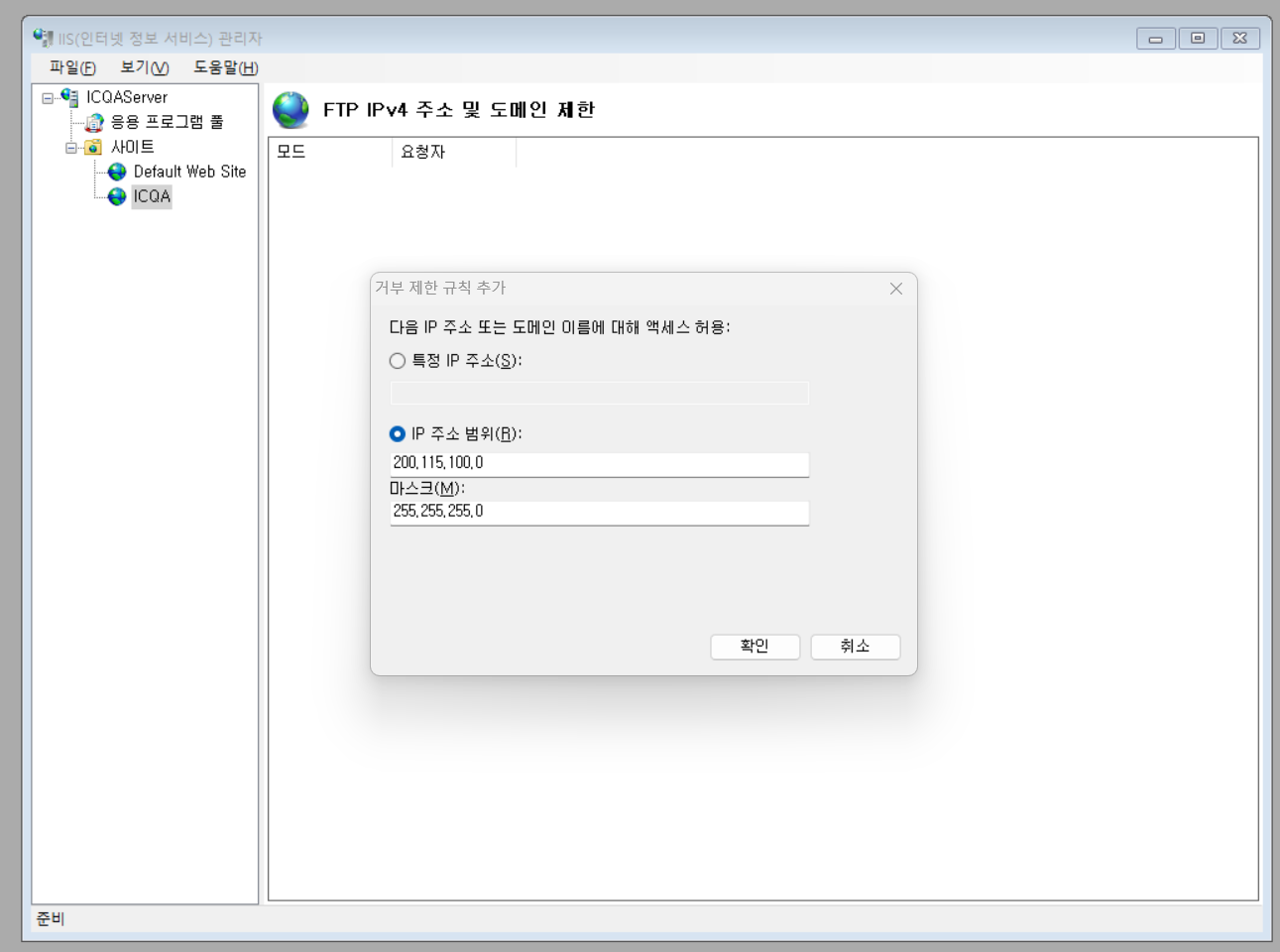 사이트 - ICQA(추가한거) - FTP IPv4 주소및 도메인 제한 - 우클릭 - 거부항목 추가