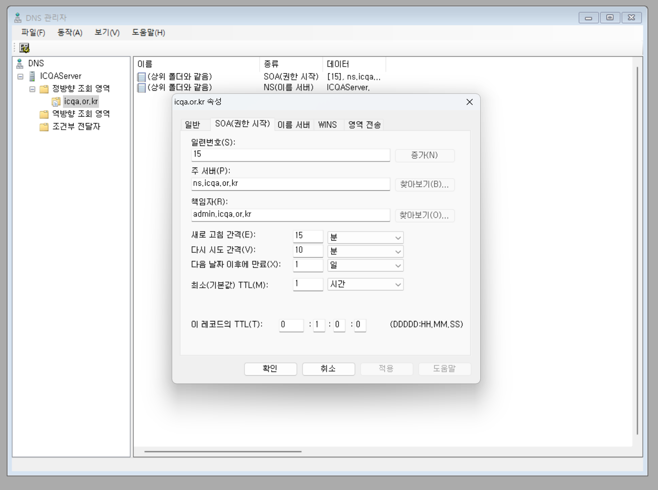 @IN SOA ns.icqa.or.kr admin.icqa.or.kr(10 ; Serial 15분; Refresh 10분 ; Retry 1일 ; Expire 1시간) ; Minimun