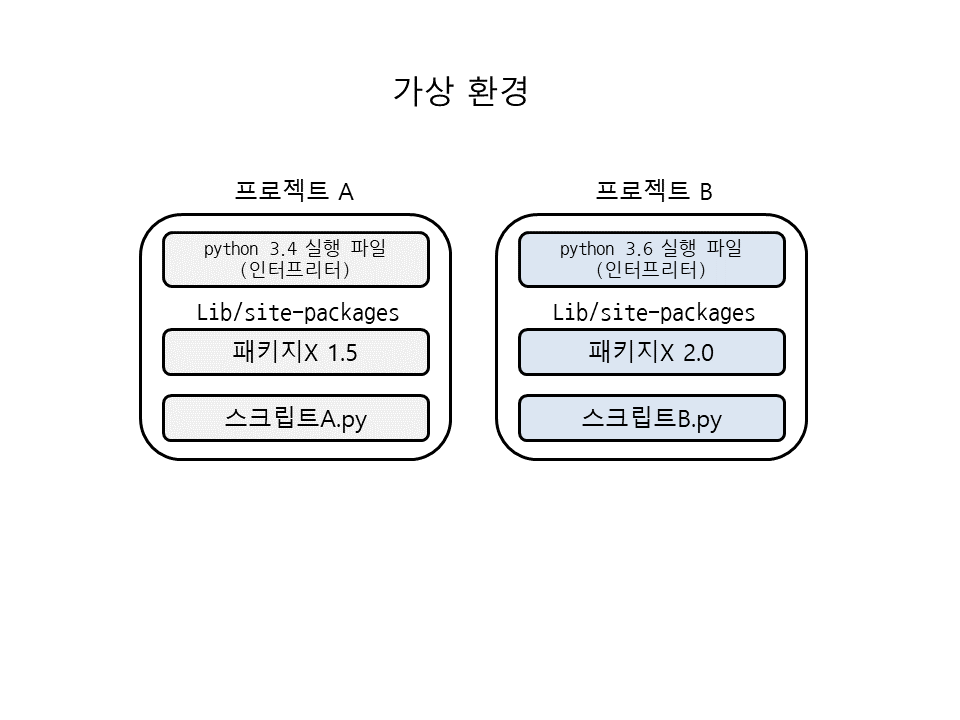 특히 가상 환경에는 파이썬 실행 파일(인터프리터) 자체도 포함되므로 각 가상 환경 별로 다른 버전의 파이썬 인터프리터가 들어갈 수 있다.
